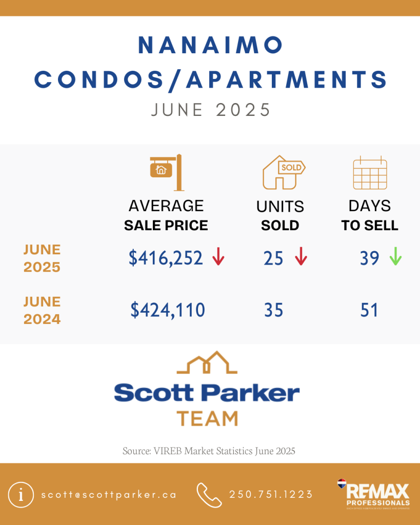 In the single-family category (excluding acreage and waterfront), 474 homes sold in June, up 34 per cent from one year ago and an increase of 16 per cent from May. Sales of condo apartments last month came in at 77, a decrease of six per cent year over year and up four per cent from May. In the row/townhouse category, 93 units changed hands in June, up two per cent from one year ago and an increase of eight per cent from May.